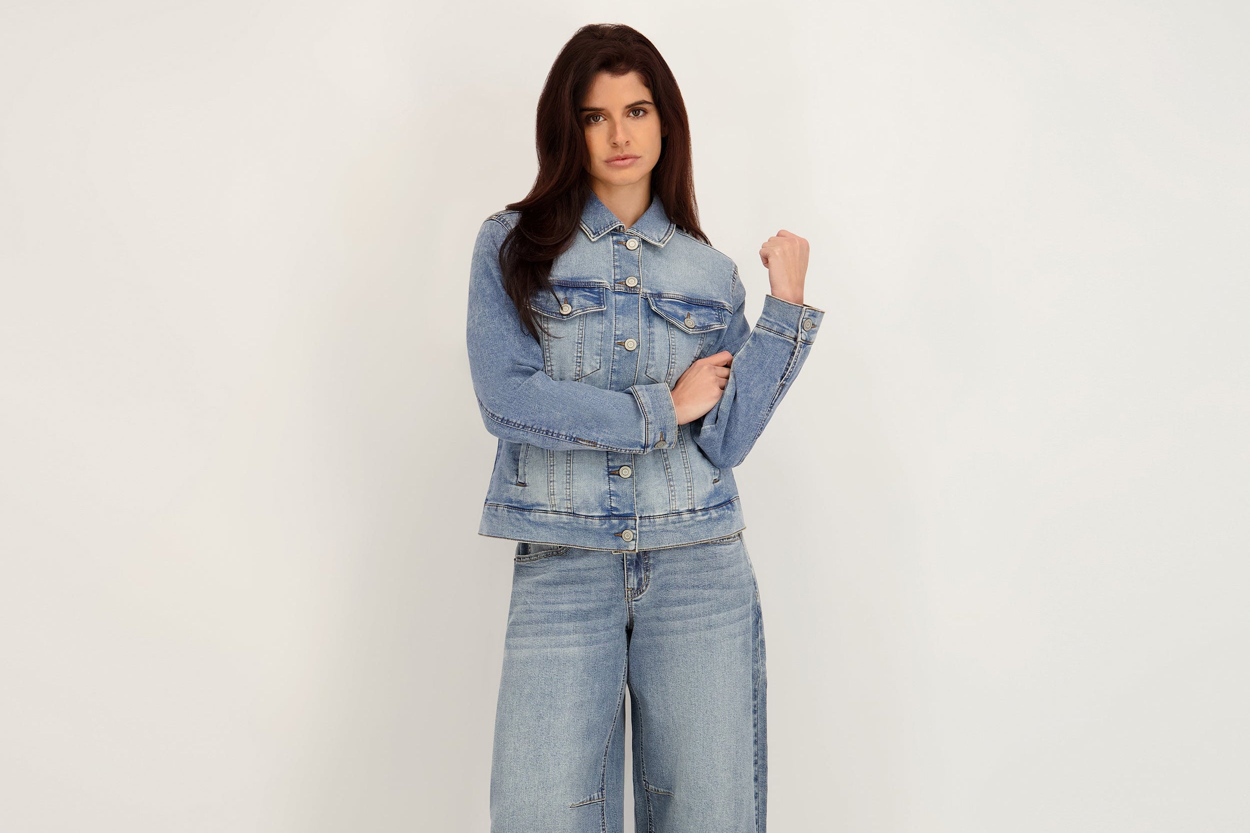 The perfect pairing. Our signature blue denim jacket styled with wide-leg linen pants for an elevated, breathable look.